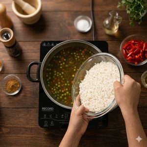 - Agregar el arroz y las verduras para lograr un arroz con pollo bien cocido y sabroso.Cuando las presas de pollo estén cocidas, retíralas de la olla y añade el arroz previamente lavado junto con las verduras. Rectifica el punto de sal y cocina a fuego bajo durante 20 minutos, o hasta que el arroz esté en su punto. Este paso es fundamental para conseguir un arroz con pollo peruano con buen sabor, textura suelta y cocción uniforme.