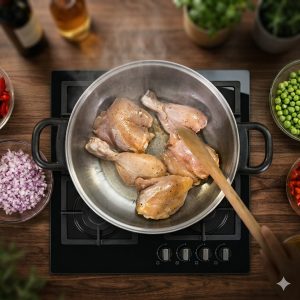- Sellar las presas de pollo por ambos lados para conservar su jugosidad.Dora las presas de pollo en una olla con aceite caliente hasta que queden bien selladas por ambos lados. Este paso ayuda a conservar los jugos, aportar mejor color y dar más sabor al arroz con pollo peruano. Luego, retíralas y resérvalas para continuar con la preparación.